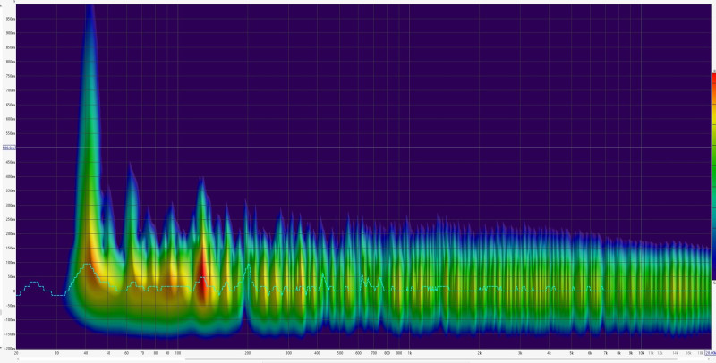 40cm-en vagyok (ennél közelebb már csak akkor tudom tolni, ha leszedem a falról az akusztikai panelt) 70cm helyett, de pontosan azt kapom mérve, amit az elméleti számok is mutatnak, tehát, hogy most 190Hz-en van egy nagy lyukam az SBIR miatt. A közép tartomány meg fontosabb, mint a mély, szóval egyértelmű, hogy inkább mélyebb frekvencián kapjak lyukat. Mivel a szoba módok miatt 130Hz-en van egy nagy tüske kiemelésem, ezért pont ott jönne jól az SBIR lyuk, tehát kijjebb húzva a hangfalat. -