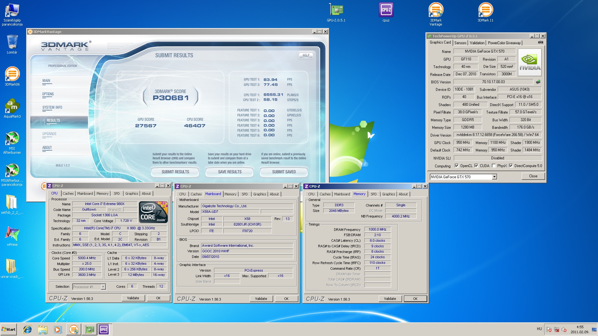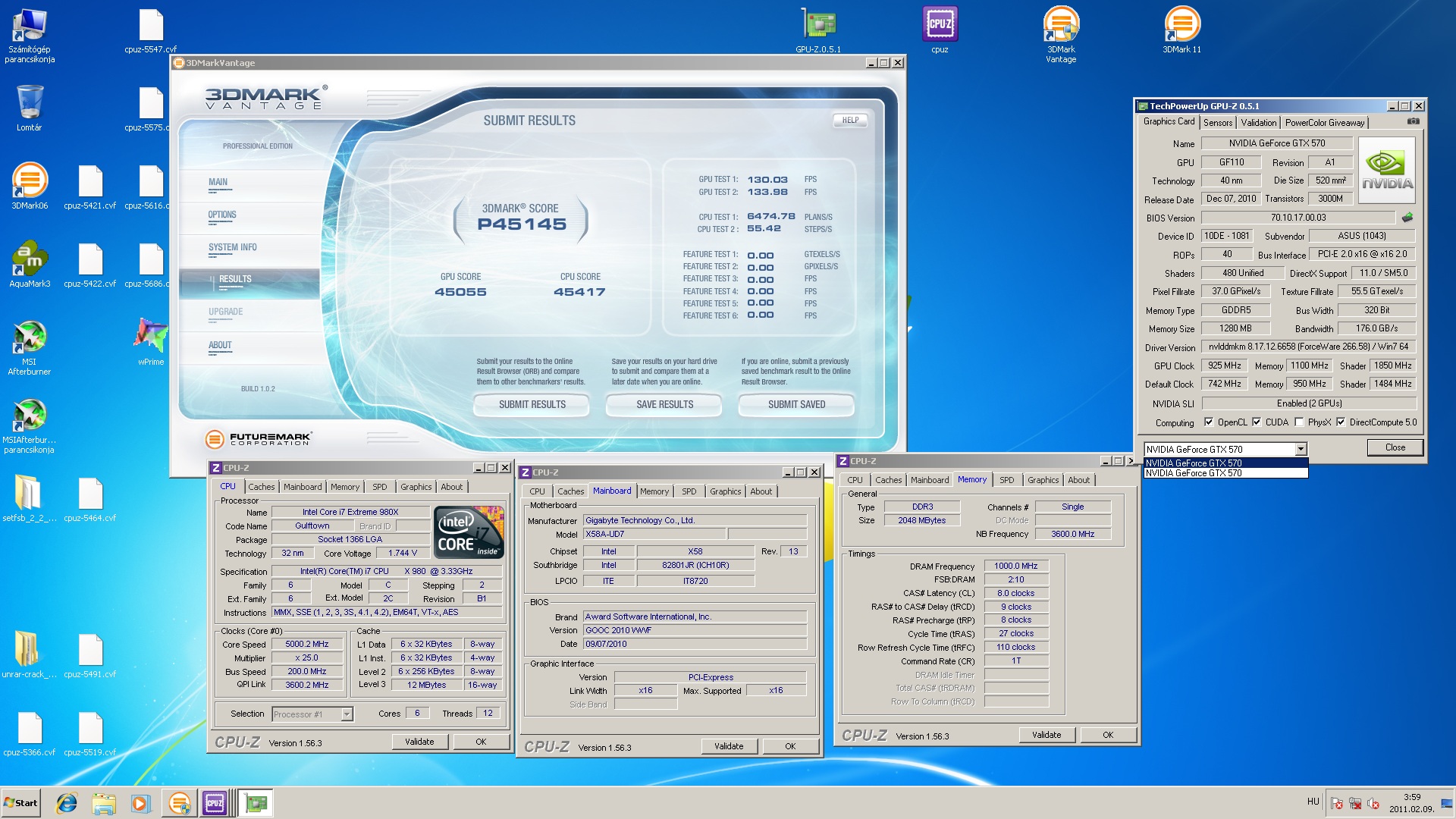 egyszer lement 5600mhz-en a cputeszt / 50300 pont / de nem bírta végig a tesztet pedig a hőfokok nem indokolták. a vgak 930/2200 at tudnak sli-ben ,de hárman nagyon fűtik egymást és nem fért bele hogy megálljon a teszt mert lehet a cpu nem bírja mégegyszer.