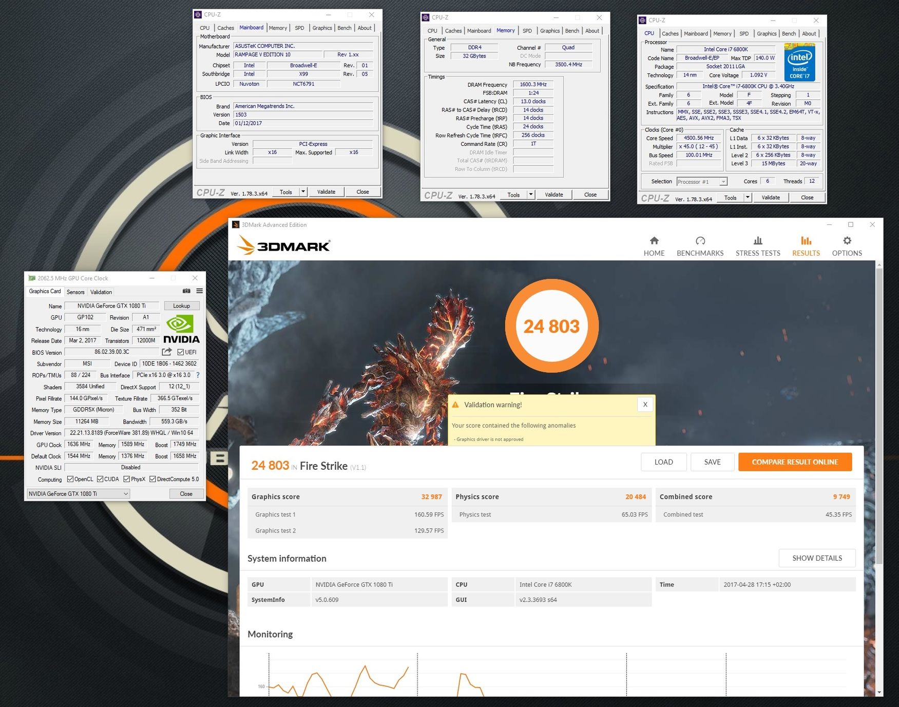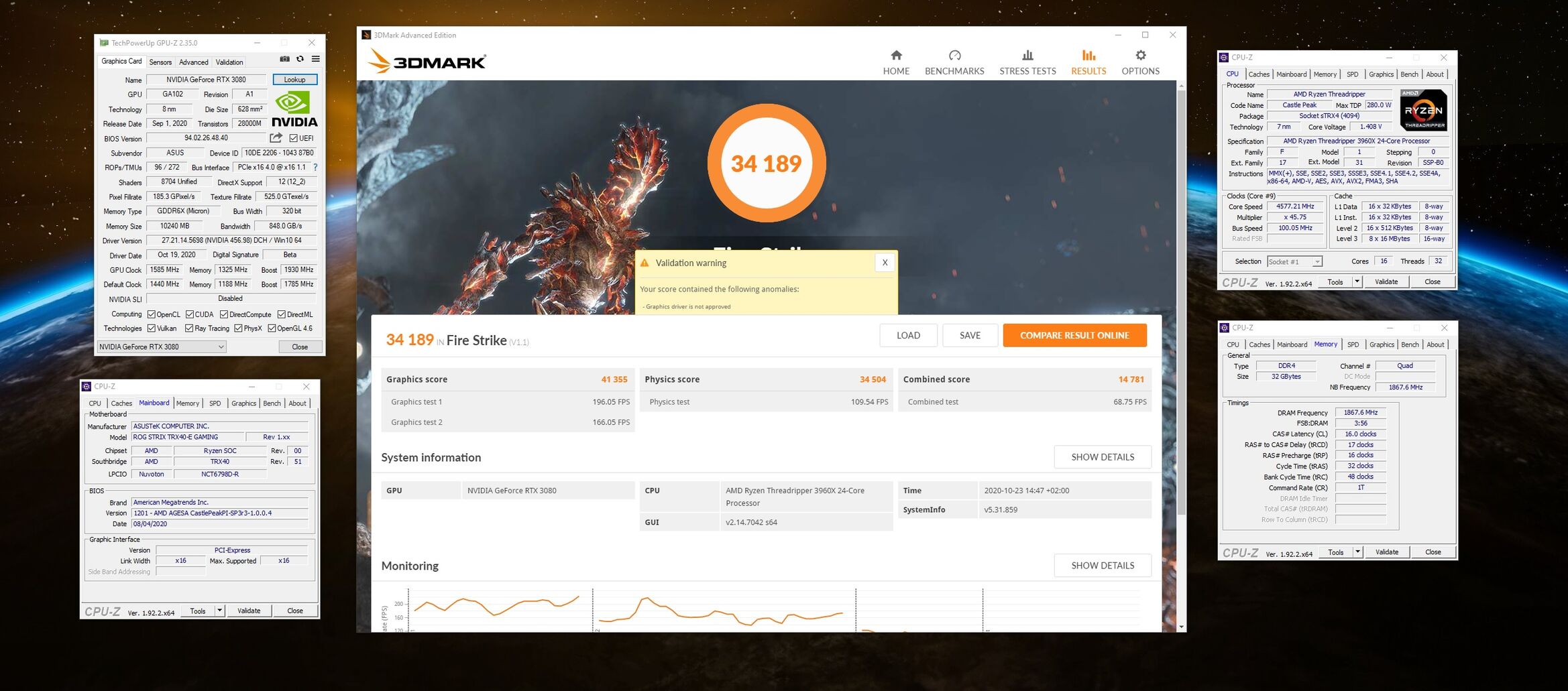 RTX3080, GPU: átlag 2050-2070 MHz, max. 2100 MHz, VRAM: 21200 MHz, gyári hűtőBemelegítő eredmény, de kérném a listára.