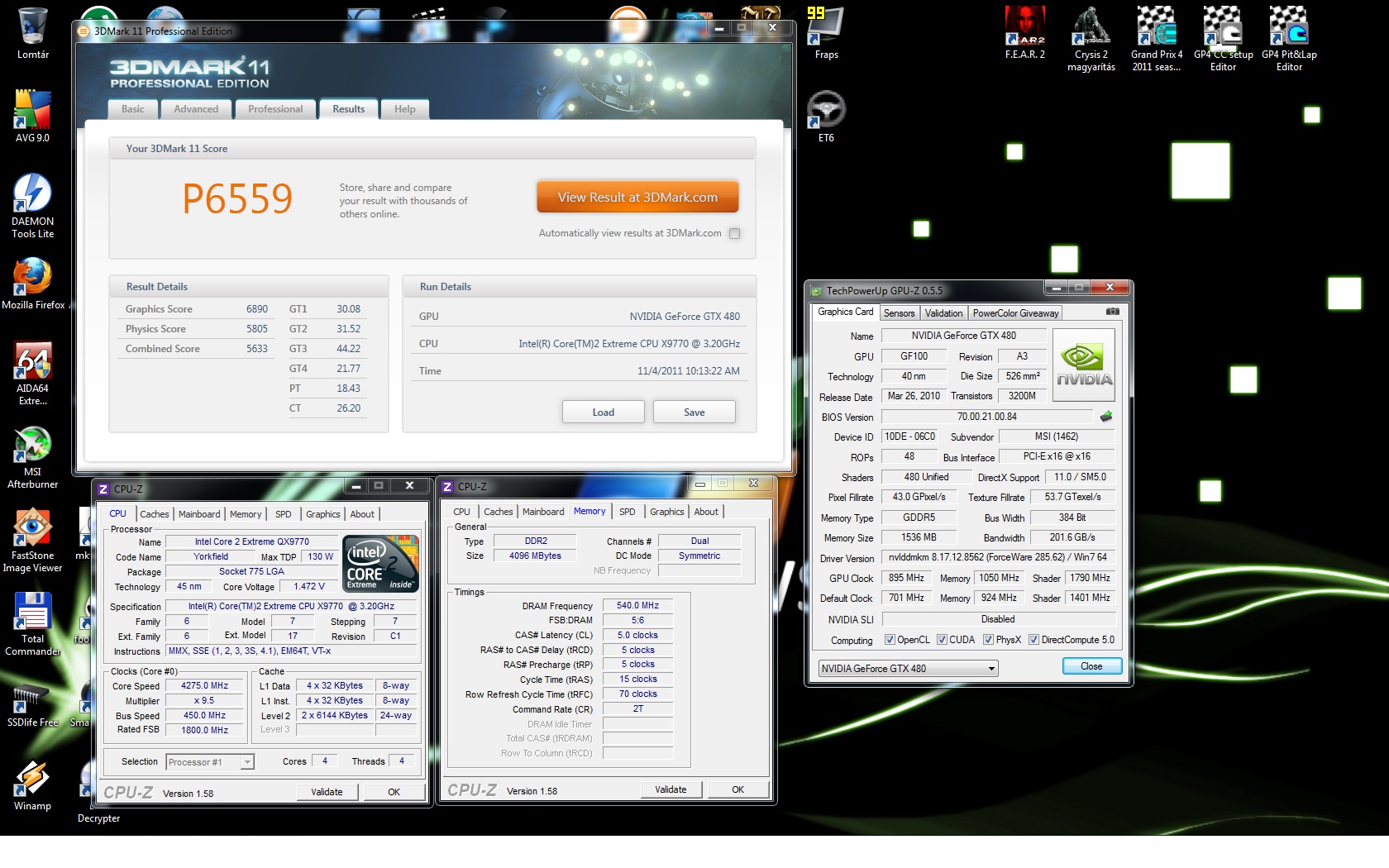 Én kimondottan a teszt erejéig húztam a kártyát és a procit is, amúgy a gtx480-at 800Mhz-on, a q6600-at 3200Mhz-en hajtom. Sajna ezzel a procival ennyit tud, mint azt megtudtam platformlimitem van. Látom alapfeszen nyomattad a karit, szerintem még van benne tartalék. Kösz a gratulációt.