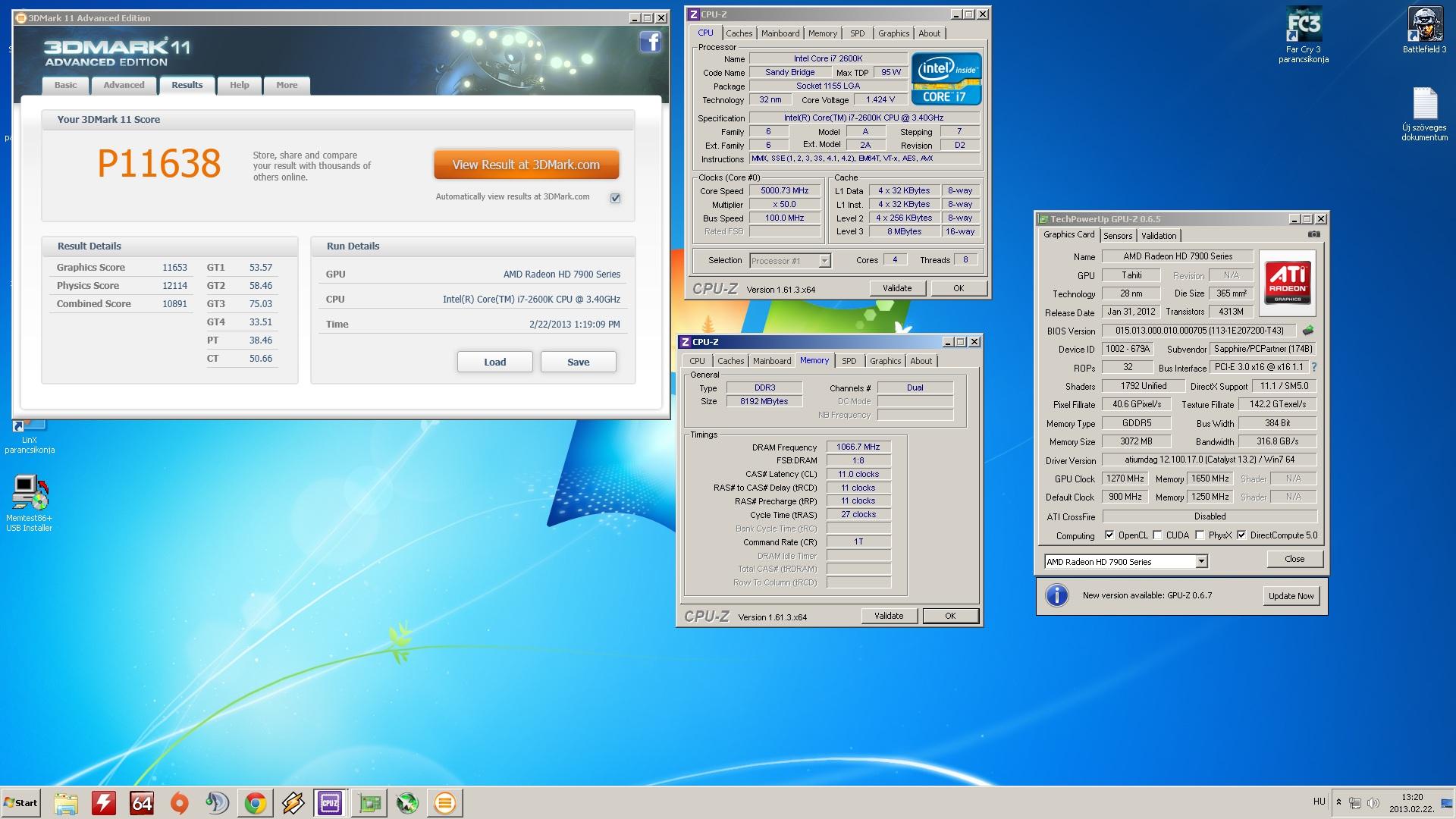 2600k 5,0GHz, hűtés Mugen3 ram 1866MHz HD 7870 Crossfire
