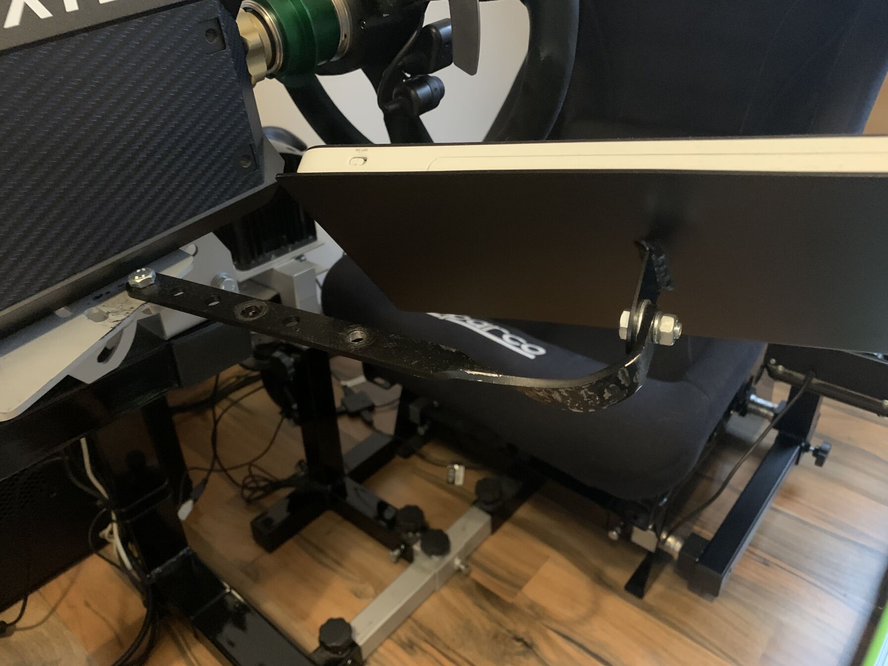 A billentyűzet-tartó kérdésében gyártattam egy keretet Atesz-al a Logi kompakt billentyűzetemhez (ezt elég sokan használják szimes körökben), a keret fülei és némi kétoldalú ragasztószalag stabilan tartja a helyén. A tartókonzol egy sima lapos vas, tengernyi furattal, mert nem tudtam mekkora lesz az ideális távolság. Nekem mozgathatóvá kellett tenni, mert ha nem használom a cockpitet, akkor össze kell szorítani a lehető legkisebb helyre. Egy önzáró anya és egy rugós alátét pont elég hozzá, nem lazul fel a hajtogatástól