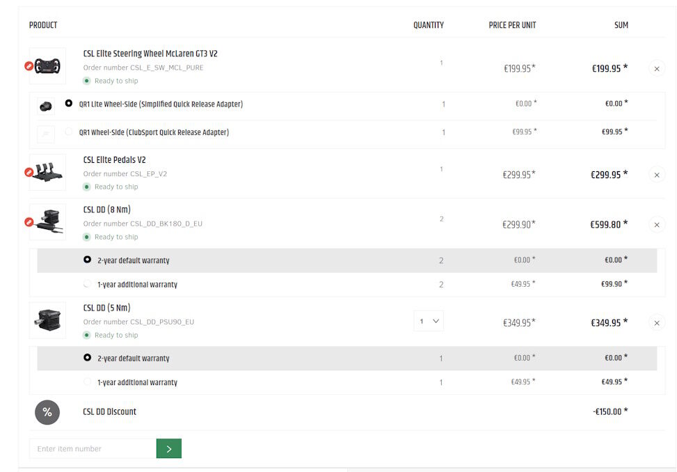 Úgy vettem észre a dolgot, hogy a kosárba már be volt pakolva az 5Nm-es base, a mekis perec meg a v2-es pedál. Mellé betettem a 8Nm-es meki bundle-t, majd elkezdtem eltávolítani a korábbi 5Nm-eshez pakolt tételeket és az utolsó volt a base. És látom még mindig írja a -150-et, mikor már csak a meki bundle meg az 5Nm-es base volt benne. Direkt kinyomntam kosárból az 5Nm-est, majd megint hozzáadtam és megint adta a -150-et.