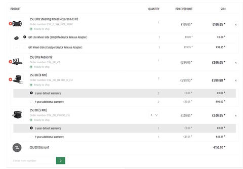 Megnéztem durva, tényleg működik. Valószínűleg a 8 nm Meki csomagban amihez a v2 pedál jár úgy van beállítva hogy eleve 299 a dd + boost táp, (199.9+99.9) és ezért ott a rendszer nem látja hogy az egy 199-es dd ezért ha mellé raksz egyet még 349-ert akkor arra el lövi a -150 eurót... Vicces.