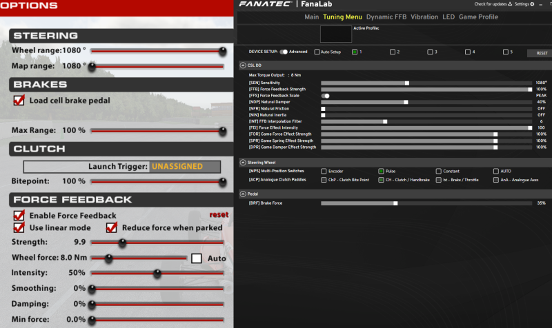 A bázis 5 setupot tud tárolni, plusz van az automata. Ezeket a setupokat lehet (gyári Fanatec) kormányról, PC-n driverből és Fanalab-ból is állítgatni. Addig amíg valamelyikkel át nem állítod, vagy Fanalabban valamelyik profillal felül nem írod, ezek a beállítások megmaradnak és kormányról is tudod váltani. Szóval PC nélkül is tudod váltani és finomhangolni is ezt az 5 profilt, akár menet közben is (rendszeresen csinálom, hogy verseny közben egy-egy hosszú egyenesben a gumikopást kompenzálva állítok a fékerőn, meg ha fáradok akkor veszek le az FFB-ből).