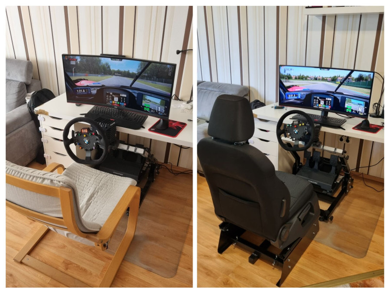 Másfél óra szerelés, állítgatás, csavarkiválasztás, stb. után jött a gyakorlati teszt. A Fanatec v2-es pedálomat a Poang "hintássága" miatt csak 15%-os Brake Force-al tudtam használni, de az első próbálkozásom az új üléssel már 25-30% körül volt. Hungaroringen 10 kör után tizedre azonosan megfutottam a legjobb időmet (nem gondotlam volna). Ami a legjobban szembetűnt hogy sokkal konzisztensebben tudok menni - eddig azt hittem hogy ez egy kicsit elcsépelt szimulátoros fogalom, de rájöttem hogy nem, valóban létezik.