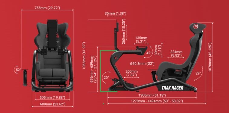 Szeretnék a közeljövőben egy Trak Racer TR8 Pro keretet rendelni. Viszont nem vagyok biztos a méretekben. TV másra is van használva, ezért falikonzolon van (és szeretném is így hagyni). Amikor szimulátorozok előrehúzom TV-t egészen közel wheelbashez. Sajnos nem tudom ez működni fog-e ezzel a kerettel. Weboldalon lévő számokat nem pontosan értem, 2 érték is van és a nyilak szerint wheelbase tálcáig méri. Ez most kerék és kerék nélküli értéket akar jelölni, vagy az kisebb szám a váz teteje (akkor bajban leszek)?