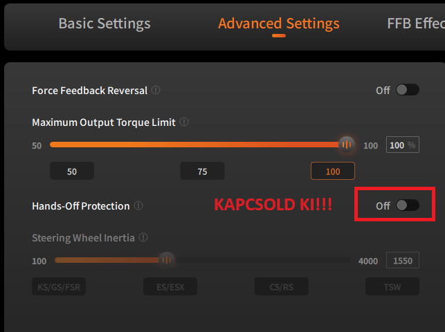 Egyesével végig próbáltam mindent. Végletekben. Amint bekapcsolom a Hands-Off Protection-t (amit kezdőknek nagyon ajánl a Moza