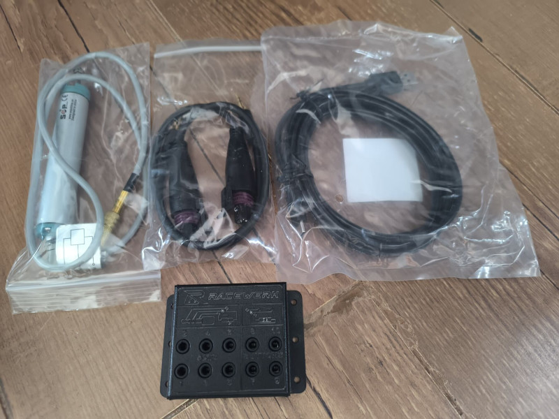 Egy lineáris ipari poti, jack dugóra bekötve, két nyomás szenzor csatlakozó szintén jack dugós és az 1.5-ös vezérlő plusz az USB kábel hozzá: