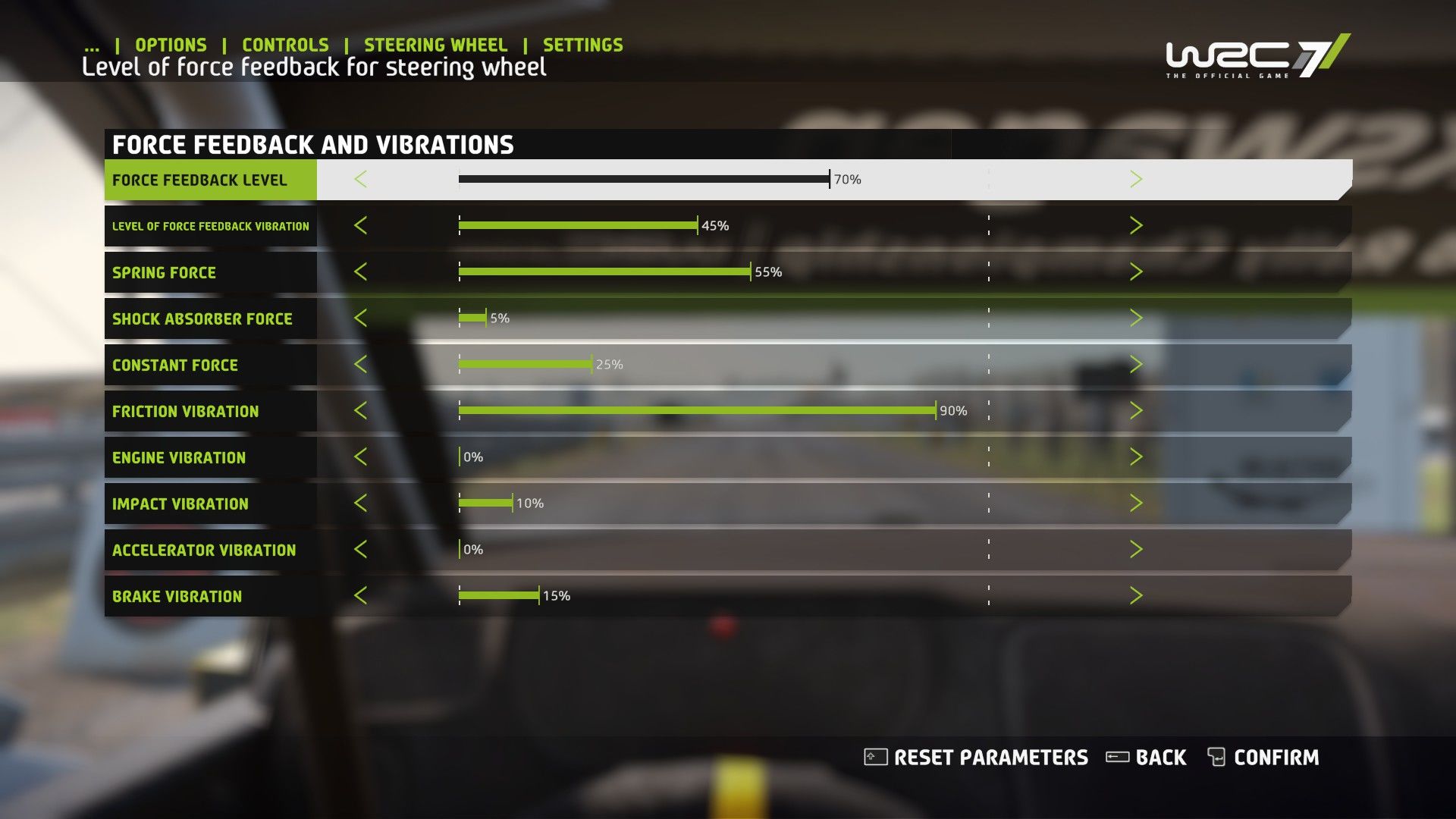 FEI-50A kormány beállítást használom Dirt Rally-hoz is, külön nem állítgattam, csak a játékon belül.