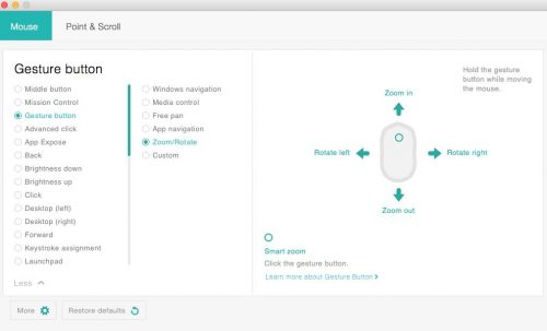 Ha nem menne, mint az előző típus esetén, akkor sem lenne gond. Hozzáadod alkalmazás specifikusan és kész. Most is van 6-féle beállításom, attól függően, mit csinálok éppen. Pl.: képszerkesztőben nagyítás-kicsinyítés, a középső gomb 100%, Finderben pedig a szokásos holmik, de jobbra-balra döntés az másol és beilleszt. Jobbra fent tudod hozzáadni ezeket...