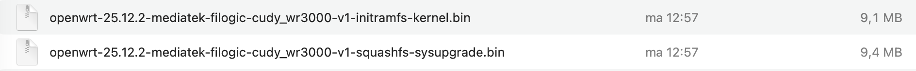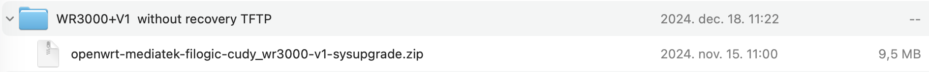 4. attersz hivatalos OpenWrt-re: a mar altalad is linkelt oldalrol letoltod a WR3000 v1-hez tartozo sysupgrade fajlt (pont azt, ami a masodik kepeden 9.4 MB-os: "openwrt-25.12.2-mediatek-filogic-cudy_wr3000-v1-squashfs-sysupgrade.bin")