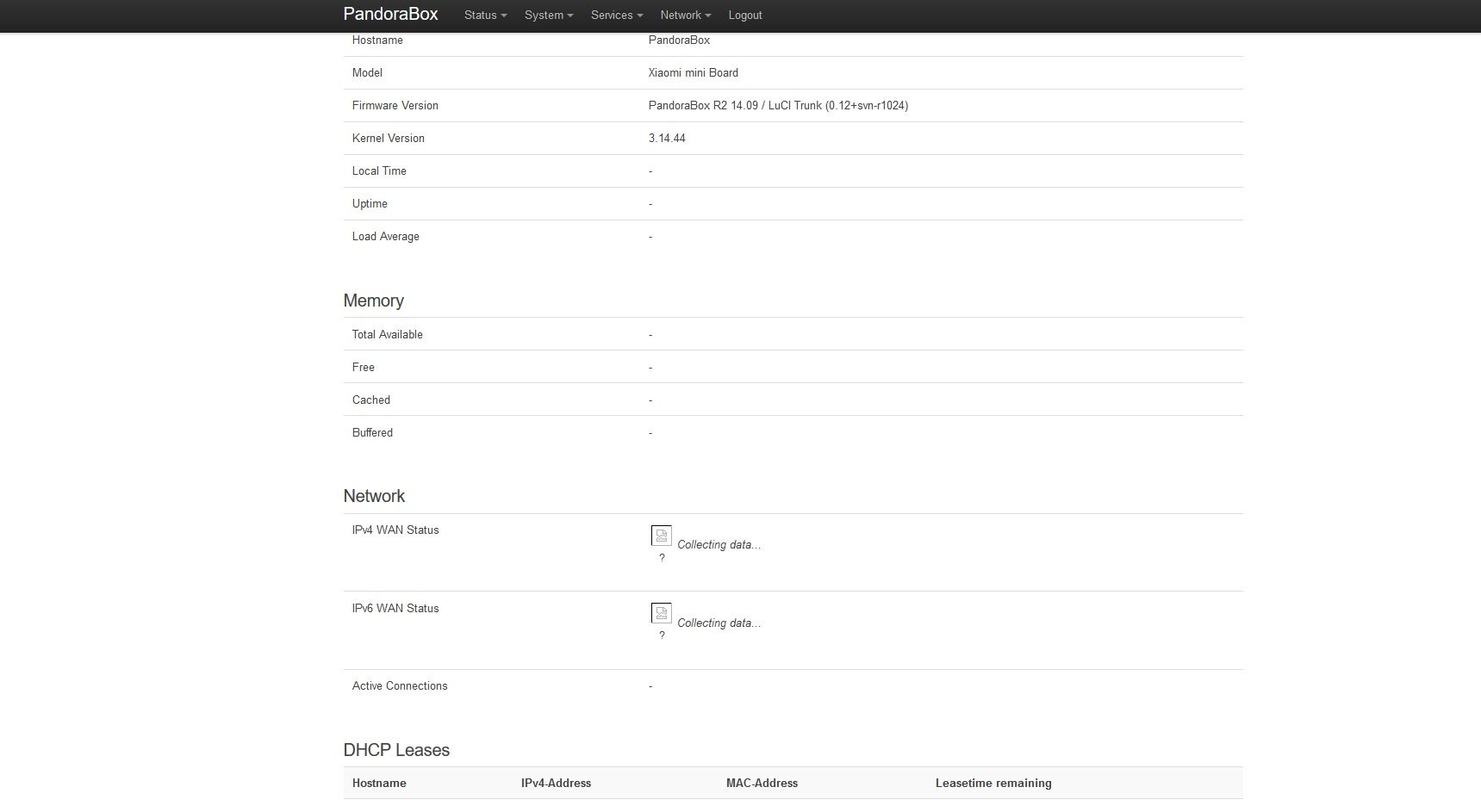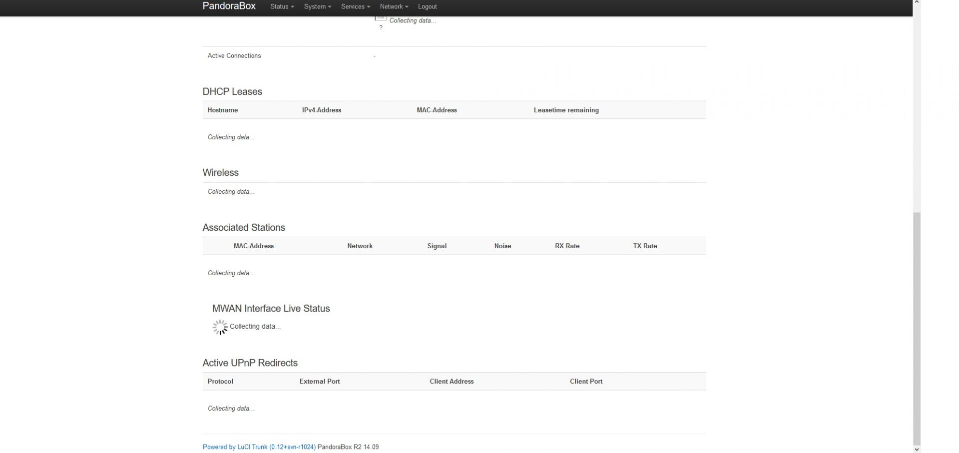 Van egy óriási problémám a routeremmel. Szinte kezdetektől Openwrt van rajta (pandorabox). Most kezdett egy olyat csinálni, hogy a luci felületén nem mutat bizonyos dolgokat és csak tölt tölt és tölt. Azt írja collecting data.