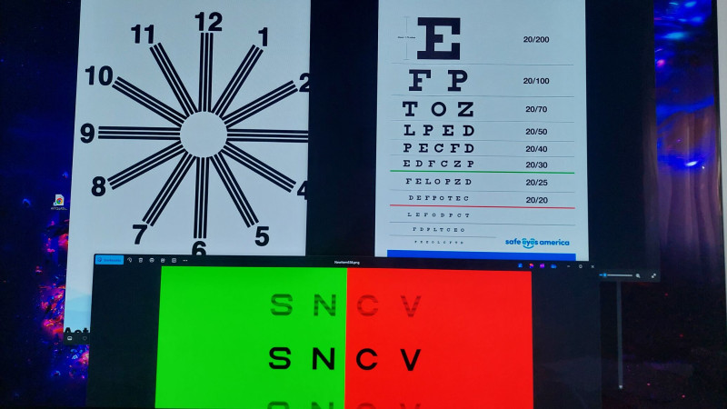 Pár napja megjött a próbakeret a lencsékkel. Tesztábrának a Snellen féle mellett döntöttem (otthoni tesztelésre bármelyik másik is jó) és az asztigmia teszteléshez a clock 3 vonalas ábrát használom. 4 méterre lett beállítva a tv kijelzőjén a táblák (betűk) mérete.