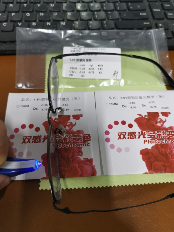 Közben érdekesség képpen megtaláltam az Ali chat-ben a képeket az eladótól, amiket küldött a szemüvegről letesztelve UV-val meg kékfény ledes lámpafélével. Sajnos a lencsék papírcsomagolásán nem szerepel márkajelzés. Google fordítót ráküldtem a képre: 1.61 ultra-tough (szuper kemény?), kékfényszűrős, fényre sötétedős (szürke).