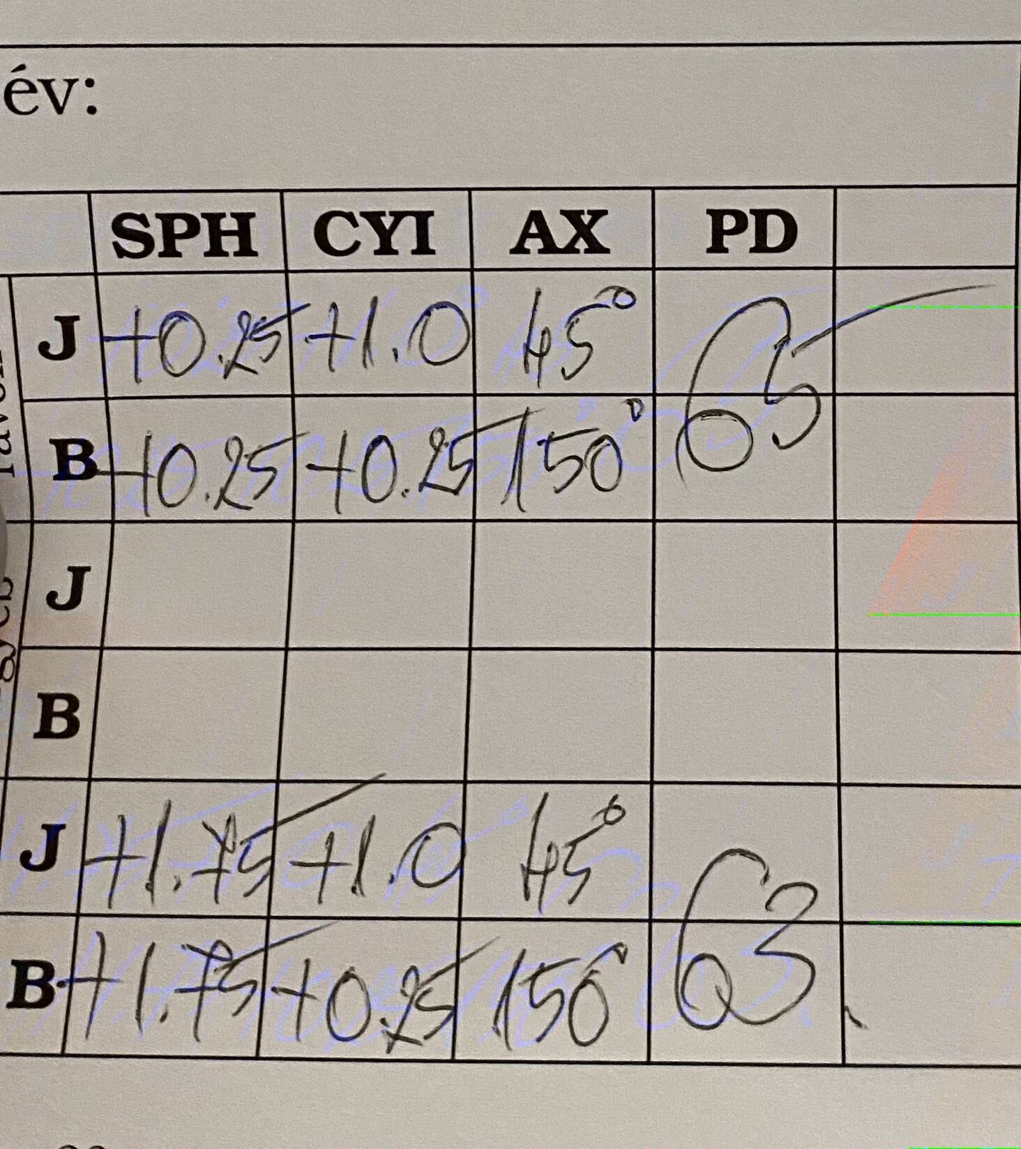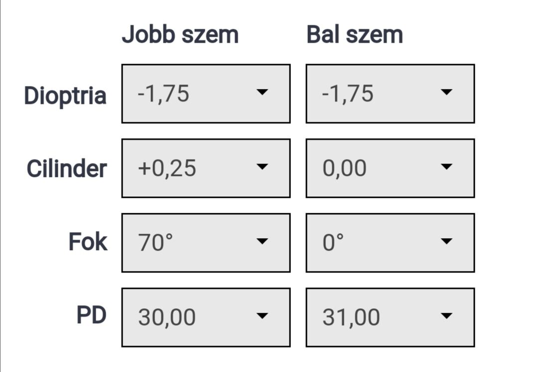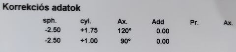 (bal: -2,00 cyl: -0,50 axe: 050° add: +0,00 , jobb: sph: -2,25 cyl: -1,00 axe: 090°add: +0,00)
