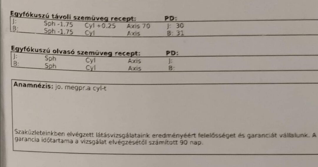 A kapott papírt megnéztem és ott van távolra és közelre is dioptria és a szokásos dolgok.