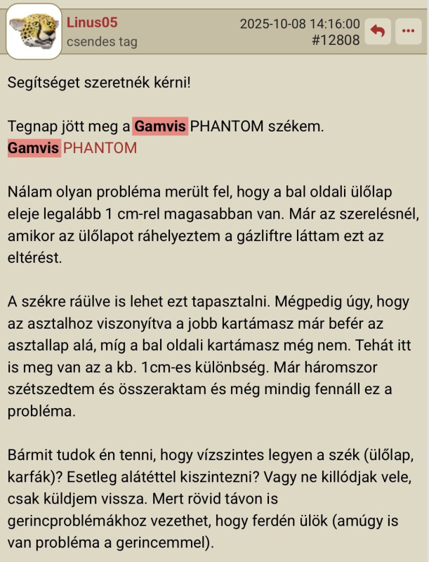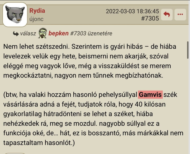 sikerült is 0-ra redukálni. Elvittem egy esztergályoshoz aki pár perc alatt fúrt bele másikat és kis küzdelem árán visszaszereltem. Közben persze kiderült , hogy nem csak én voltam a ludas mert már a gyárban ferdén fúrták a karra a menetet , de ez már másodlagos. Én lehet szerencsés vagyok , de nekem minden funkció hibátlanul működik. Nem recseg nem ropog , nem lóg sehol . A mesh feszessége és mintázata is olyan hibátlan mintha tegnap gyártották volna. A lábcsillagtól eltekintve , ha nem is újnak , de újszerűnek simán mondanám. Személy szerint nagyon elégedett vagyok vele. Múltkor behoztam egy napra az irodába és este lusta voltam hazavinni. Betoltam a gép elé otthon a régi gamer székemet és a sírás elkapott , de az asszony is mikor hazajött és kérdés nélkül belehuppant csak nézett , hogy bírtunk ebben régen ülni és mindjárt leszakad a gerince.