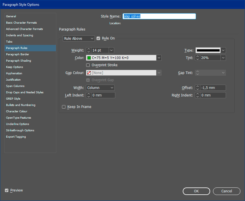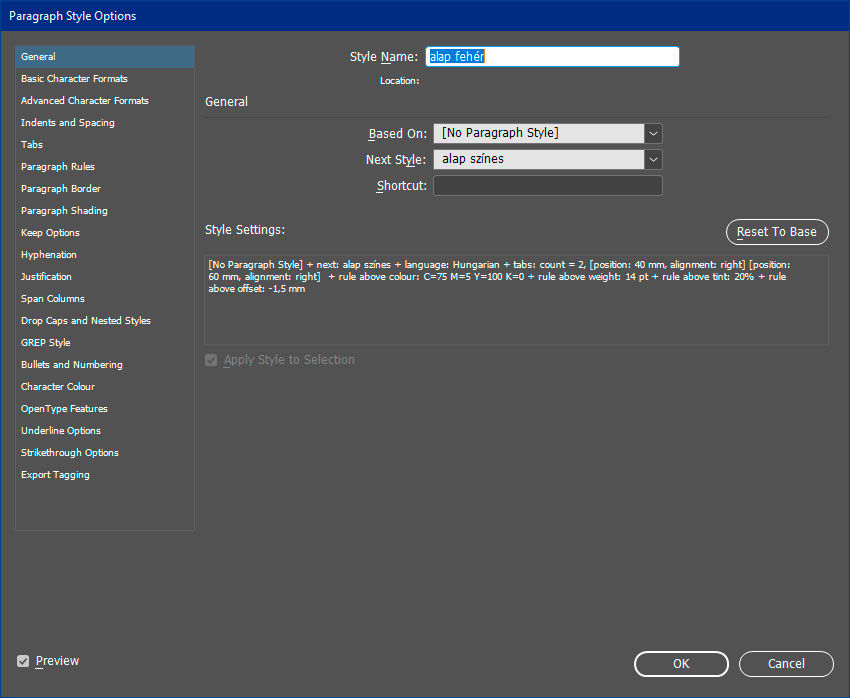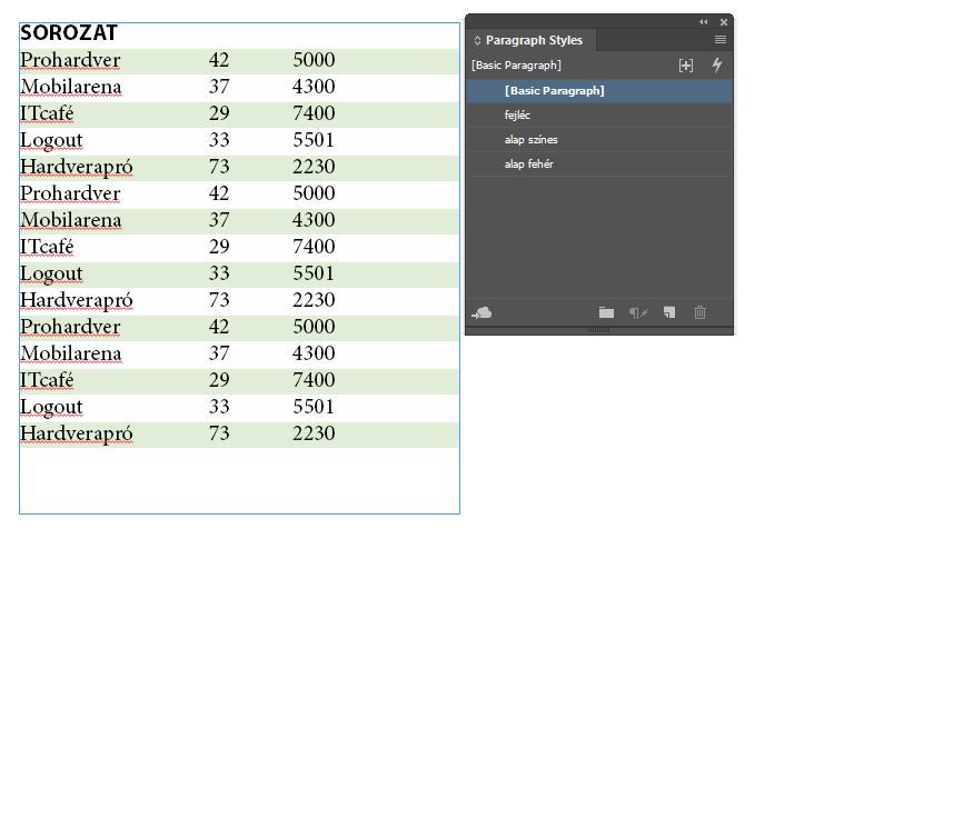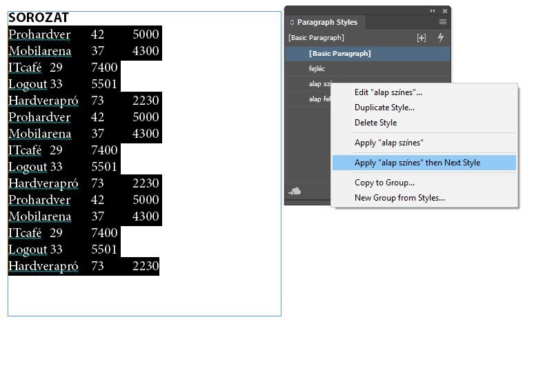 Persze, a local override minden elemre alkalmazható. Vagyis rányomod a stílust a teljes szövegboxra és utána az adott sorban módosítod az elemet (Ctrl Alt J). Ilyenkor a paragraph style palettán a stílus neve mellé kerül egy kis + jel. [kép] A módosítás csak arra az egy sorra lesz érvényes, vagyis az alap stílus (színes, fehér) később módosítása esetleg ezekre a sorokra nem lesz érvényes.