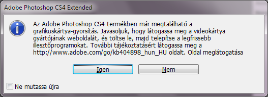 "Az Adobe Photoshop CS4 termékben már megtalálható a grafikuskártya-gyorsítás. Javasoljuk, hogy látogassa meg a videokártya gyártójának weboldalát, és töltse le, majd telepítse a legfrissebb illesztõprogramokat. További tájékoztatásért látogassa meg a