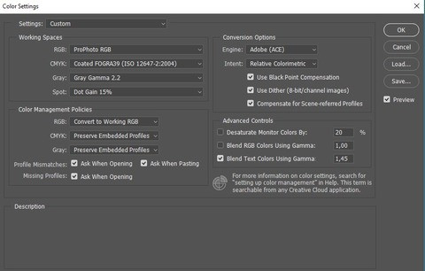 én speciel prophoto rgb színteret állítottam be a PS alá, mivel én LR-mal együtt használom, ami csak prophoto-t használ (melissa rgb, mindegy, majdnem ua), és legtöbbször LR-ból ugrok át PS-be, emiatt oda-vissza színkonverzió lenne, ha a PS más színtérben dolgozik. meg néha nyomtatok is, kiállításra, meg 98% adobe rgb a monitorom, így nem redukálom srgb-re a színeket. majd a végén, ha kell.