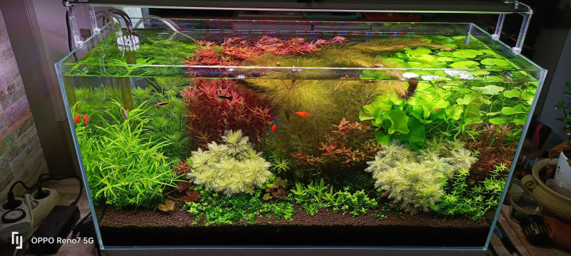 A mostani 96 literesemnél ledes(közép kategóriás )a lámpa és co2 van 0-24 h- ban,vízcsere szintén heti 20%lágy víz ,tápozás hasonló. -