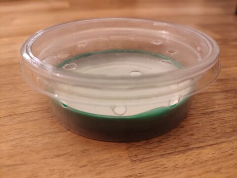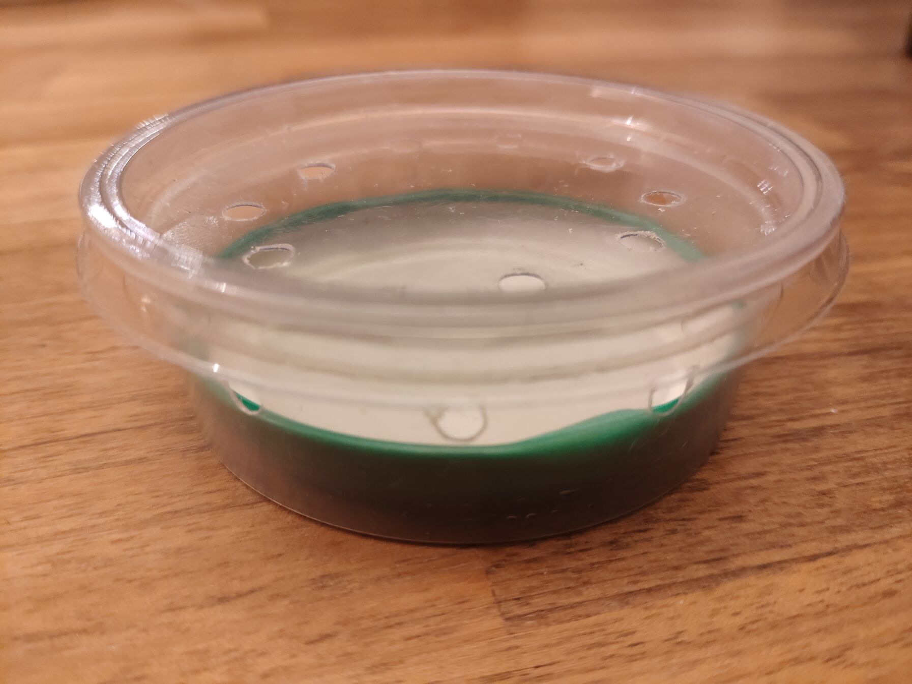 Egy sima műanyag kis dobozos, az aljában egy lekváros üveg tetejével, hogy nem ússzon fel.