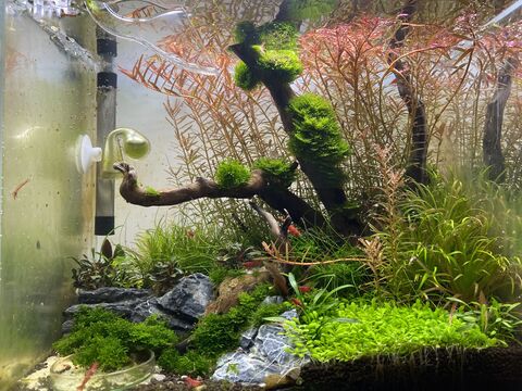 Egészen összeállt a garnis nano, kellett neki egy kör NoPlanaria mert ellepték a hidrák, de azóta az alga is visszaszorulóban, tele lett minden pici garnikkal, folyamatosan van petés nőstény, és max. kéthetente nyírni kell a Rotalát.