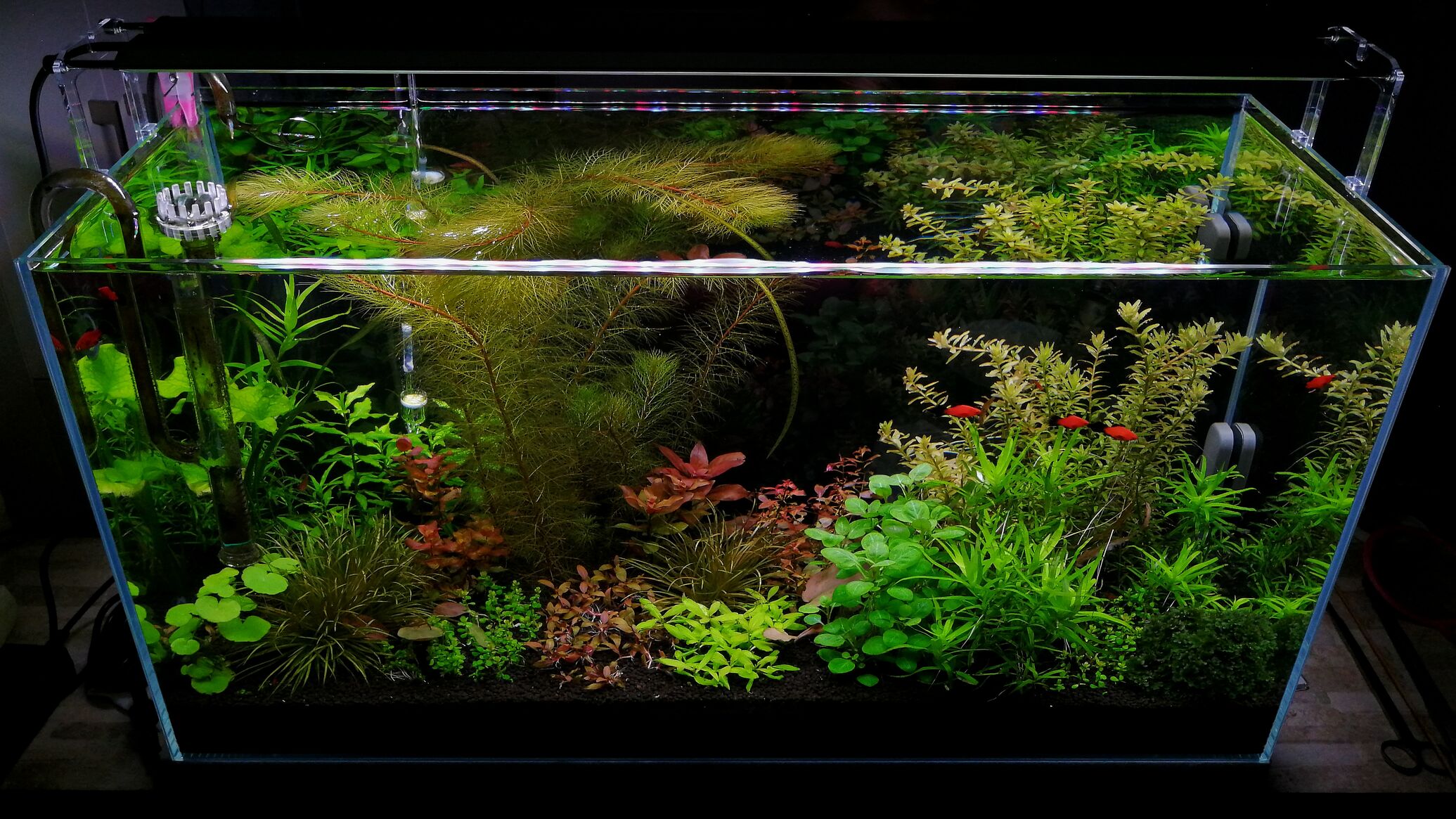 Kb 80% csapvíz Seachem Prime kondícionálóval kezelve, 20% ioncserélt van az akváriumban (120 liter), PH rendben, vízkeménység lehetne lágyabb is. Nitrit/Nitrát a tesztcsík szerint nincs különösebben, vizet meg gyakran cserélgetem az incidens óta, akkor nagy részét (+ restart baktériumkultúra bele), azóta napi 5 litert, hétvégi takarításnál extra 15. Szintén változtattam, a tetős, fénycsöves megoldás helyett nyitott, WRGB ledes lett, a növények látványosabban fejlődnek.