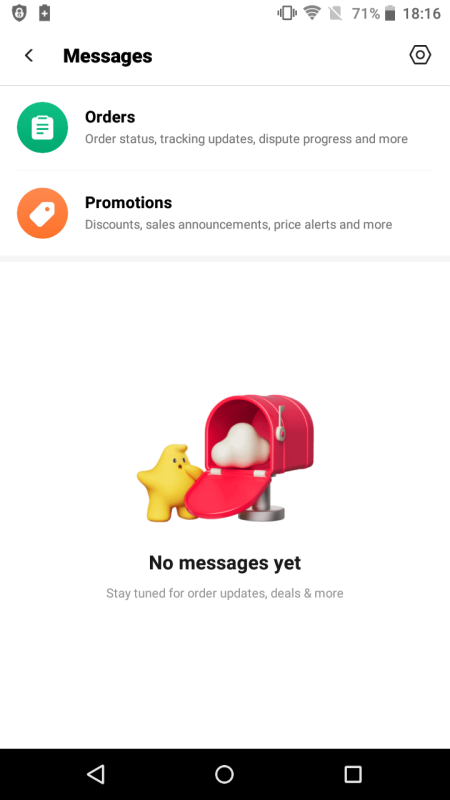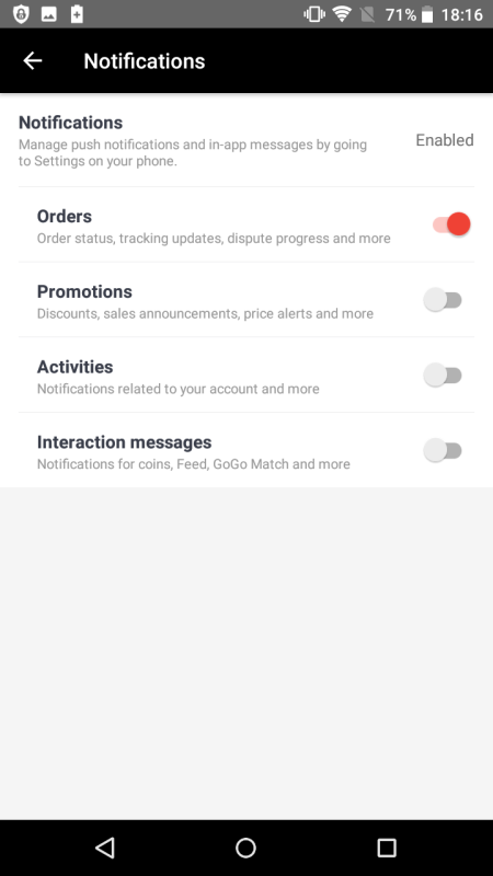 Bemész az értesítésekbe, felül jobbra a menü ikon, és ott kikapcsolhatóak. 5 menüpont lesz: minden értesítés kikapcsolása, vásárlás/tracking értesítés, promociók, aktivitás, érme és játék értesítések. Nálam csak az Orders van engedélyezve. Nincs semmi szemét! -