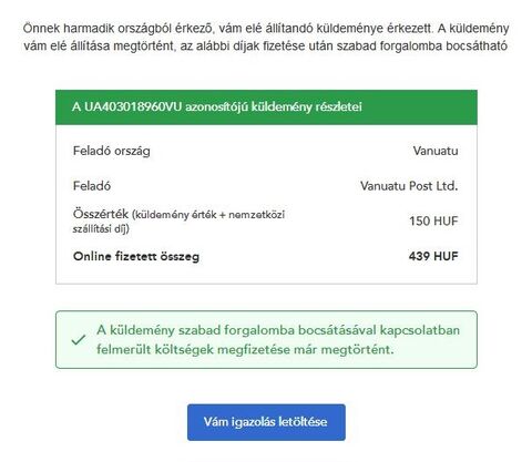 Segítséget szeretnék kérni. Kaptam egy sms-t, hogy érkezett csomagom, fizessek be 439.-FT-ot. Beléptem, beazonosítottam a HF-el és befizettem. Erre a vámigazoláson szerepel, hogy a csomagom Vanuatu-ból érkezett, pedig azt hittem, valamelyik Alis csomagom jött meg. Ez 399.-+ 40 Ft-ÁFA-t takar. A csomagot azóta sem láttam (ez valami 150.-Ft-os), de az igazoláson az nem szerepel, hogy a befizetést követően a posta kézbesíti a csomagot. (miért nem szerepel?). Mi akar ez lenni? Valami Vanuatu kalóz dolog? Mondjuk nem sok, de akkor is. A megadott küldemény azonosítóval utólag nem lehet a küldeményt a magyar postán beazonosítani. (UA403018960VU). Nyilván, ahogy kifizettem, kézbesítettnek nyilvánítja. De nem jött semmi! Megkaptam a vámolási számlát is rendesen.
