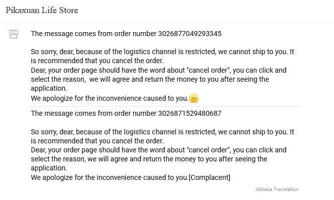 So sorry, dear, because of the logistics channel is restricted, we cannot ship to you. It is recommended that you cancel the order. Dear, your order page should have the word about "cancel order", you can click and select the reason, we will agree and return the money to you after seeing the application. We apologize for the inconvenience caused to you.