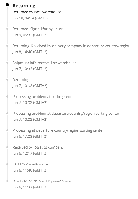 A processing centerből valami miatt visszafordították. Az első tétel Expiredre váltott, az után vissza is kaptam az összeget, a többi megragadt "Awaiting delivery" állapotban, bár a trackingnél "Package returned to local warehouse. Inbound success." az utolsó állapot. Ilyenkor mi van? Újra küldik? Az az érdekes, hogy az első tétel is kifutott a processing centerbe, de mintha külön mozgott volna, és az előbb is lett ilyen állapotú, pedig egyszerre lett feladva a megrendelés. Az első tétel csomag azonosítóját már nem tudom megnézni, a többié sorban: LP00655321172967, LP00654744070606 és LP00655321922646.