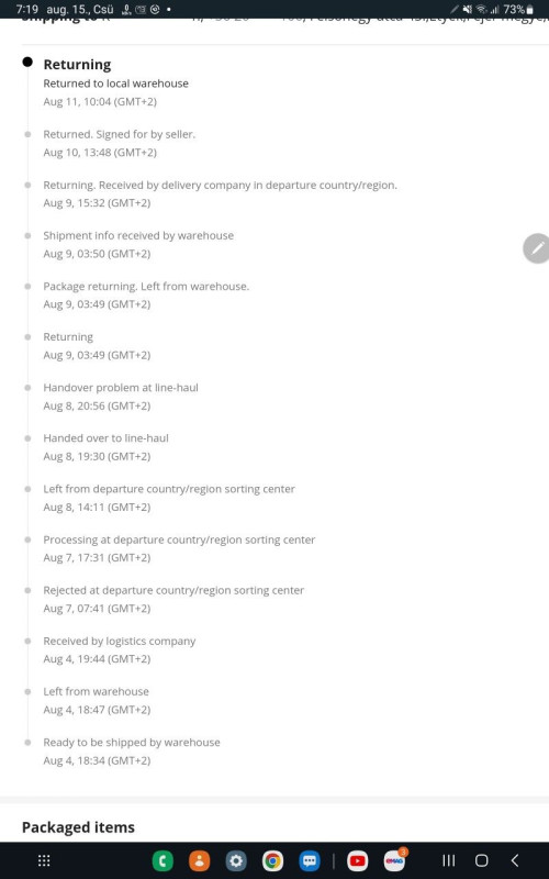 Erre megírták, hogy a csomag rendben van, de mivel a megadott szállítási határidőhöz képest késett a csomag, ezért visszaküldhetem, a feladó fizeti a szállítási költséget és visszaadják a vételárat