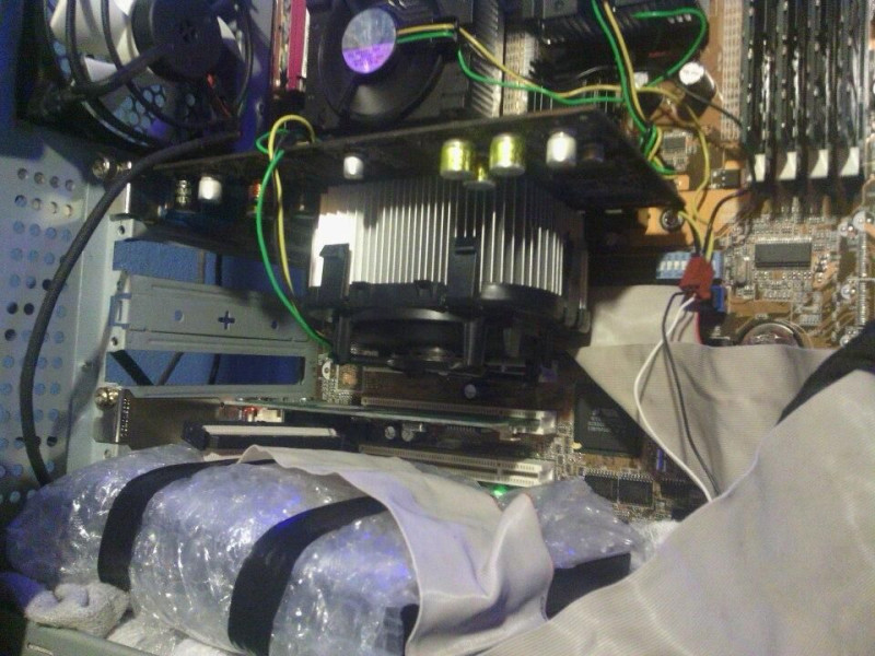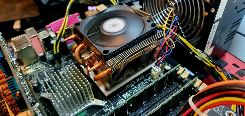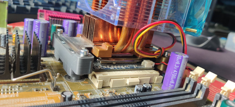 A nehezítés annyi benne, hogy egy Powerleap átalakító volt a foglalatban, majd ebbe ment a 478-as P4 amit hűteni szerettem volna, de ilyen felfogatás nem nagyon létezik, ahol az AeroCool hőcsöves rámegy a 423-ra. Végül rövid ideig teszteltem, majd elfogadtam, hogy működik a dolog. Azóta igaz nem foglalkoztam vele.