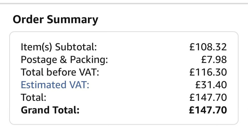 Ha nem lett volna ott a számított ÁFA, akkor itt lenne vámkezelés 150€ alatt 0% a VÁM, de lenne vámkezelési költség (szállító függően) és 27% ÁFA.