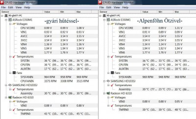 A gyári hűtés és a mostani passzív hűtés hőmérséklet összehasonlítása (üresjáraton és kb. 20-22celsius fokos szobában mérve):