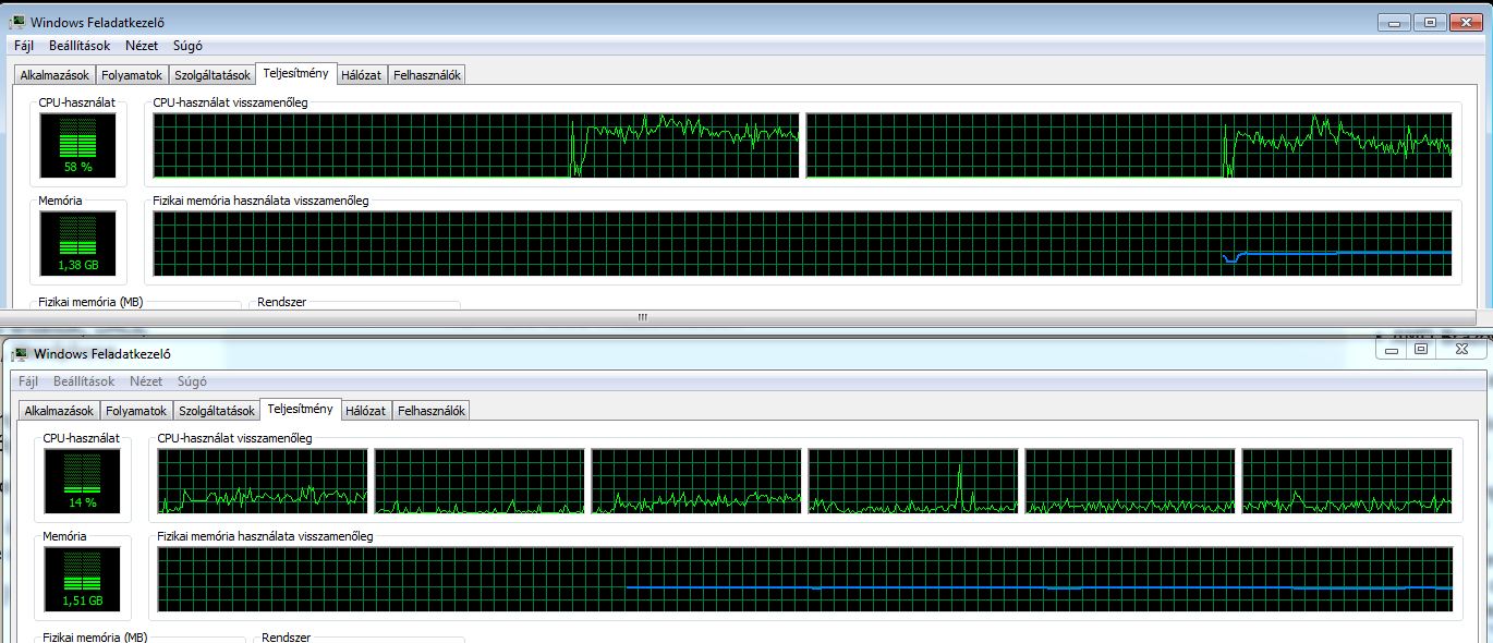 Én első körben a vírusirtóra gyanakodnék... Nálam igaz nem olyan volt fenn, mint nálad, de az Atom-os gépemen szépen felfuttatta a CPU-használatot a valós idejű keresés! Egy Core2-es CPU-hoz értelmetlen egy E350-et hasonlítani, ugyanis nagyon más célra készültek! A Core2 az elérhető legjobb teljesítményre, a Brazos viszont a lehető legkedvezőbb fogyasztás/teljesítmény/használhatóság mutatóra! Elég igazságtalan egy asztali, ~100W-os TDP-jű C2Quadhoz hasonlítani egy 18W-os TDP-s mobil procit...