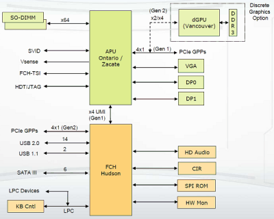 "A vezérlőhíd szerepét a Hudson M1 jelzésű lapka tölti be, amely 65 nm-es gyártástechnológiával készül. A chip a megszokott funkciók mellett hat darab 6 Gbps-os SATA, 14 darab USB 2.0 és négy darab PCI Express x1-es csatornát biztosít"