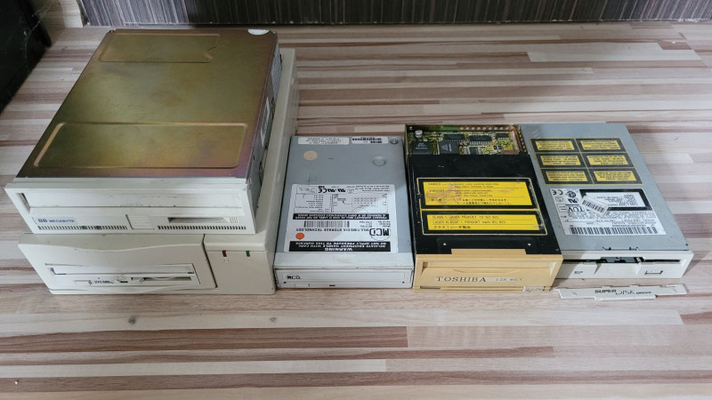 Meg ha már ilyen egzotikus tárolók, előszedtem a többit, van egy kicsit szétesett előlapos superdisk meghajtó, egy Toshiba 128MB valami, és még egy.
