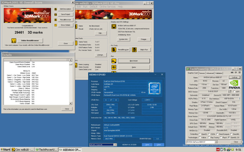 Kicsit irigykedve néztem a 6600GT-s eredményeket, gondoltam, tud ez jobbat is, csak proci kell alá. Tudott, de sajnos annyival nem, mint reméltem. Ez a proci 4 GHz alapórajelet, 4,5 GHz turbot tud, reméltem, hogy látványosabb lesz a különbség. Az eredmény a 47. helyre is jó lenne, de végig rengeteg képhibával futott mindegyik tesz, szóval gpu tuningra inkább nem is gondolok. Megmondom őszintén, nem nagyon figyeltem a tesztek alatt az egymagosokkal, de nem rémlik, hogy lett volna hiba.