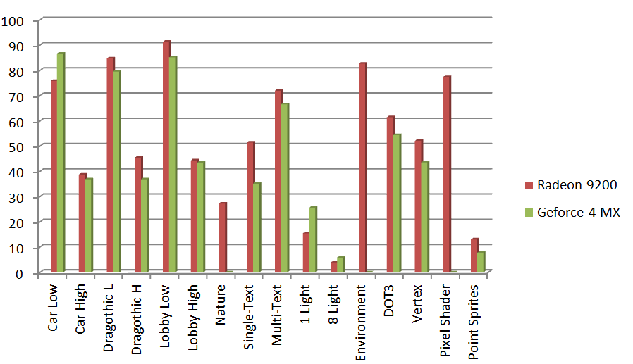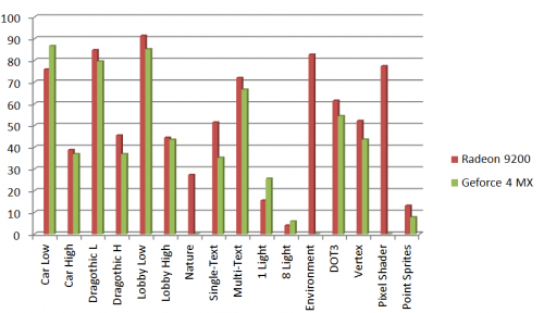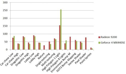 Egymás mellé raktam az értékeket, láthatóan a nagy különbség a nem támogatott tesztek miatt van, (a nature a bump mapping és a 8.1-es pixel shader teszt) de egyébként a dx7-es tesztekben azért nincs szégyenkezni valója a lassított 9200-asnak. Azért az eredmény úgy lehet, hogy a Geforce-nak kedvezne (lásd polygon számítás).