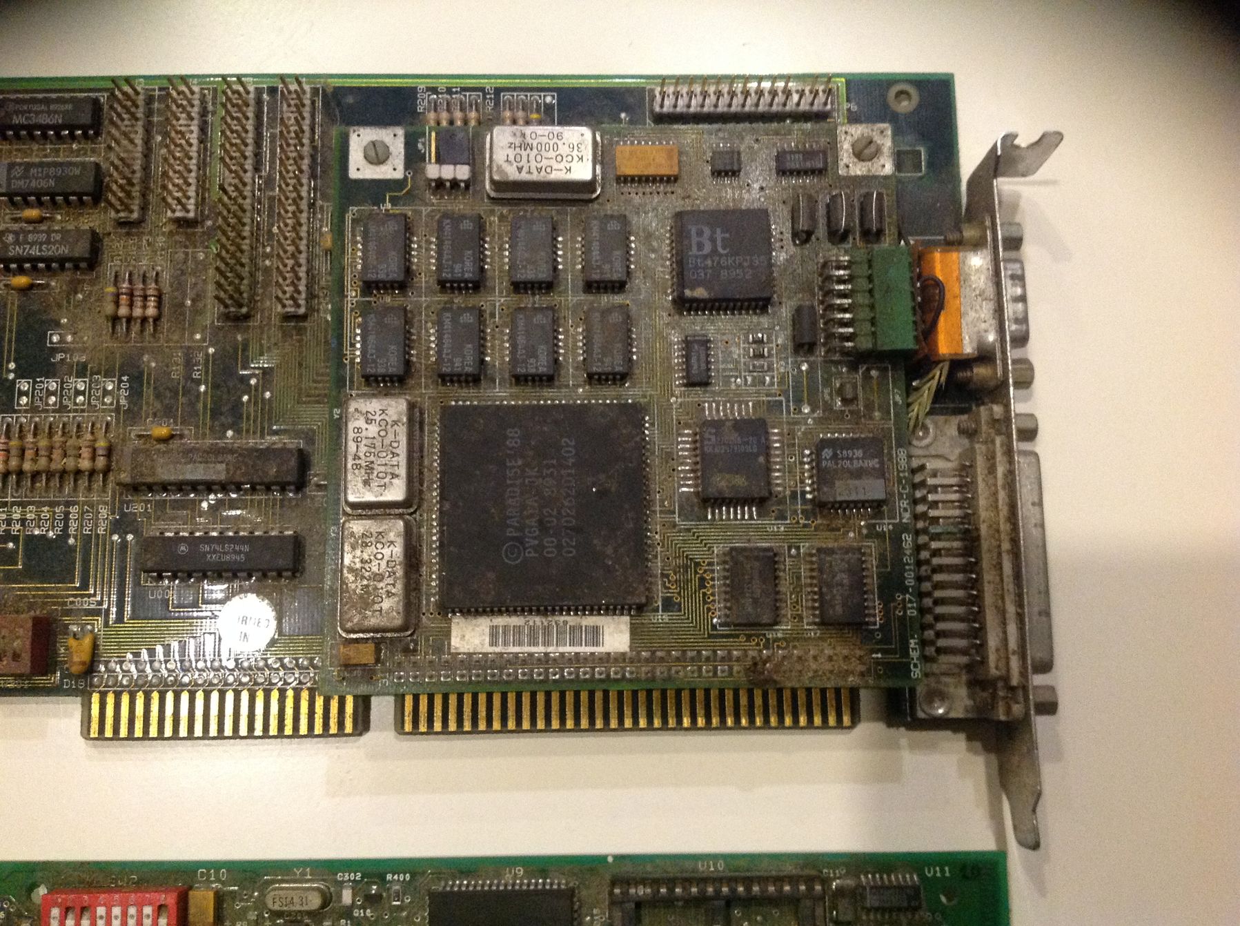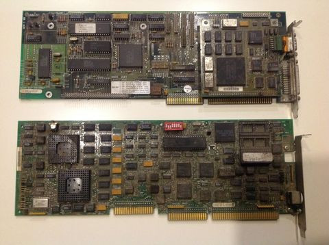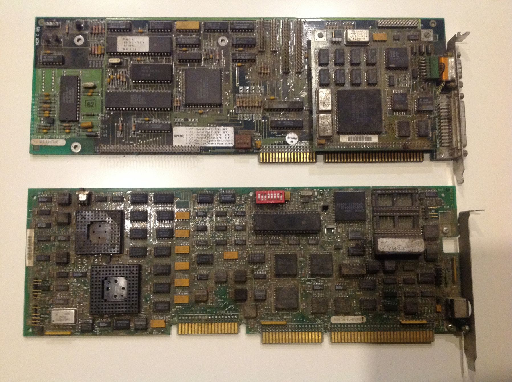 A napokban szert tettem az alábbi (fél)géphez. A típusa NCR 3386, amiről a Google alig tud valamit. Érdekesség, hogy a szokásos helyett valami inverz alaplap van benne (Backplane?), valamint a 3 egymás mellett lévő kártya egy ős SLI-szerű cuccra is rá van csatlakoztatva. A kártyák eleje erősen földes, a hátulja viszont majdnem tiszta. Érdemes lehet ebbe életet lehelni, vagy kuka az egész?