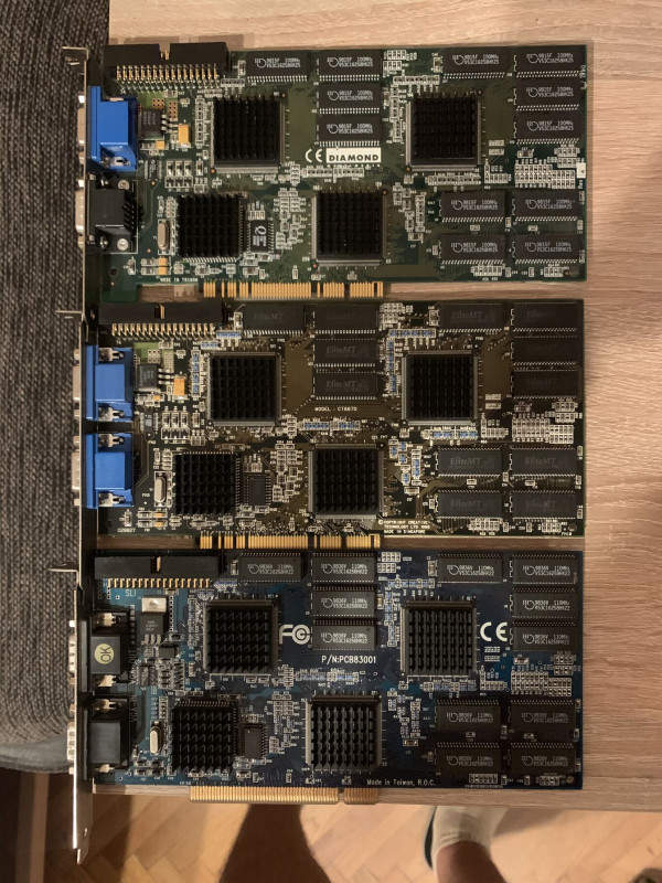 Az is latszik, hogy ezen a CMI8738-on is ott van a lab, de nem megy onnan sehova. Illetve, ha megnezi az ember ezeket a Voodoo 2 kartyakat, az is latszik, hogy amelyiken ott van, azon sem megy sehova. Az Eicon Diva ISDN kartya pedig nem is tartalmazza.