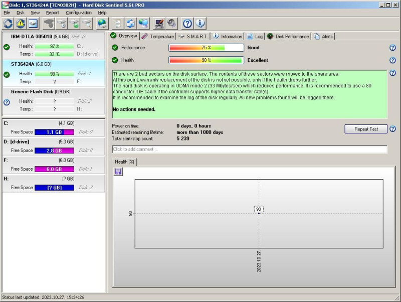 Seagate ST36424A 6GB 98% 2 bad sector 5239 start, a 0 nap nyilván hibás kiolvasás