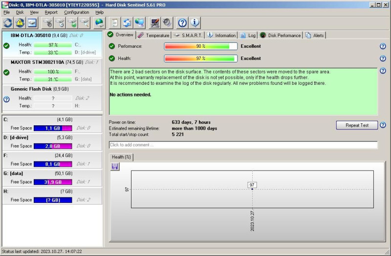 A PIII IBM gép saját gyári 10 gigás IBM-DTLA-305010 HDD-je 97% 5221 start 633nap