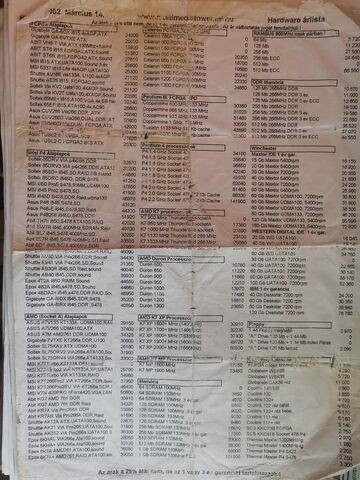 Mellékelt árlista 2000 február 19Érdemes megnézni, hogy a fent említett gépnek a fő alkatrészei is mennyire drágák, 25%-os ÁFA NÉLKÜL(!), a CPU 177 ezer, a RAM 94 ezer, a VGA 80 ezer, HDD 50 ezer, seperc alatt 400 felett van az ember nettoban (bruttóban 500K felett) és még nincs ház, monitor, perifériák stb ... Ennyi pénzről akkoriban (csóró kilencedikesként) álmodni sem mertem.