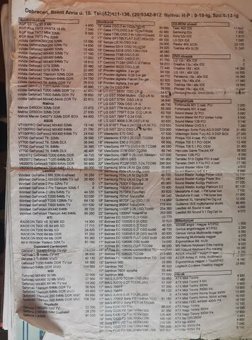 Az én hardvereim ehhez képest a "futottak még" kategóriában voltak, mint látható a mellékelt árlistán, 366-os Celeront még lehetett újonann kapni, de a kínálat alját képezte, 32MB RAM is volt, de a V3400TNT és a 3.2-es winyó már éppenhogy pont kifutott.