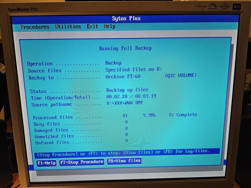 Szoftvert kellett még keresni ami hajlandó lesz kezelni a cuccost, általában a SyTOS-t javasolta mindenki, fasza kis DOS-os cucc (van Windows-os változata is de az már nem kezeli ezt a drive-ot). Ki kellett pár verziót próbálni mire megtaláltam azt ami tényleg működött, a végére Sytos Plus 1.31 lett a befutó. Szoftver felkonfig, kazi betesz. Teszt backup plan összeállít, éééésssss igen, némi kattogás és pörgetés után megindul a szalag írása komoly ~600-700 KiB / sec -el. Tiszta örö' és bódottá. Először az gondoltam írok az egészről egy cikket, de aztán gondoltam talán mást annyira nem érdekel a dolog, így csak ez a kövérebb fórumbejegyzés lett belőle.