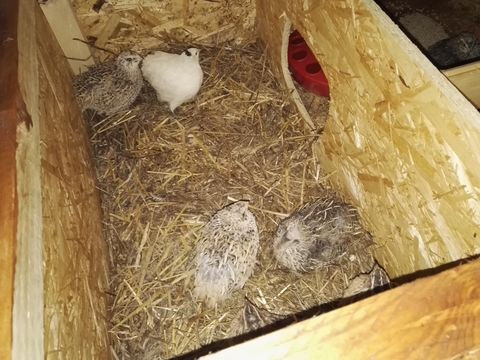Fürjek furák. Nem túl okosak. Sajnos az intenzív tartásról az átállás nem megy zökkenőmentesen... Eddig ugye kis ketrecben voltak 50-en 1 m2-őn, most 12-en vannak ~60m2-őn. Eddig 24/h volt fény, víz kaja, 24-30°C. Most meg éjjel 15 fok. Adunk nekik még pár hetet, 2 hét múlva kb. megyünk majd Szegedre, másik fürjekért, azok a nagytestűek, elvileg szabadban is tartják. Tapasztalatcsere jól jöhet. Most is alakítottunk a helyükön, az szerint, amit eddig kiderítettünk róluk. Elég stresszesek, bokros részt szeretik, magas házikó nekik nem pálya, ezért is variáltunk. Fácánféle, úgy is repül: iszonyat bénán.